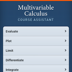 Taking multivariable calculus? Then you need the Wolfram Multivariable Calculus Course Assistant. This definitive app for multivariable calculus—from the world leader in math software—will help you work through your homework problems, ace your tests, and learn calculus concepts. Forget canned examples! The Wolfram Multivariable Calculus Course Assistant solves your specific multivariable problems on the fly, providing step-by-step guidance for limits, derivatives, integrals, and much more.